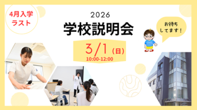 【4月入学】3/1(日)10:00~ 第9回学校説明会を開催。 2026.02.09 『学校概要説明』『入試説明』などを行い、『個別相談』では先生と1対1で相談できます😊 『施設見学』では、実際の学生生活を想像しやすくなるかもしれませんね!! 説明会に参加して入学後や卒業後の不安を解消しましょう! 皆さまの参加をお待ちしています🤗